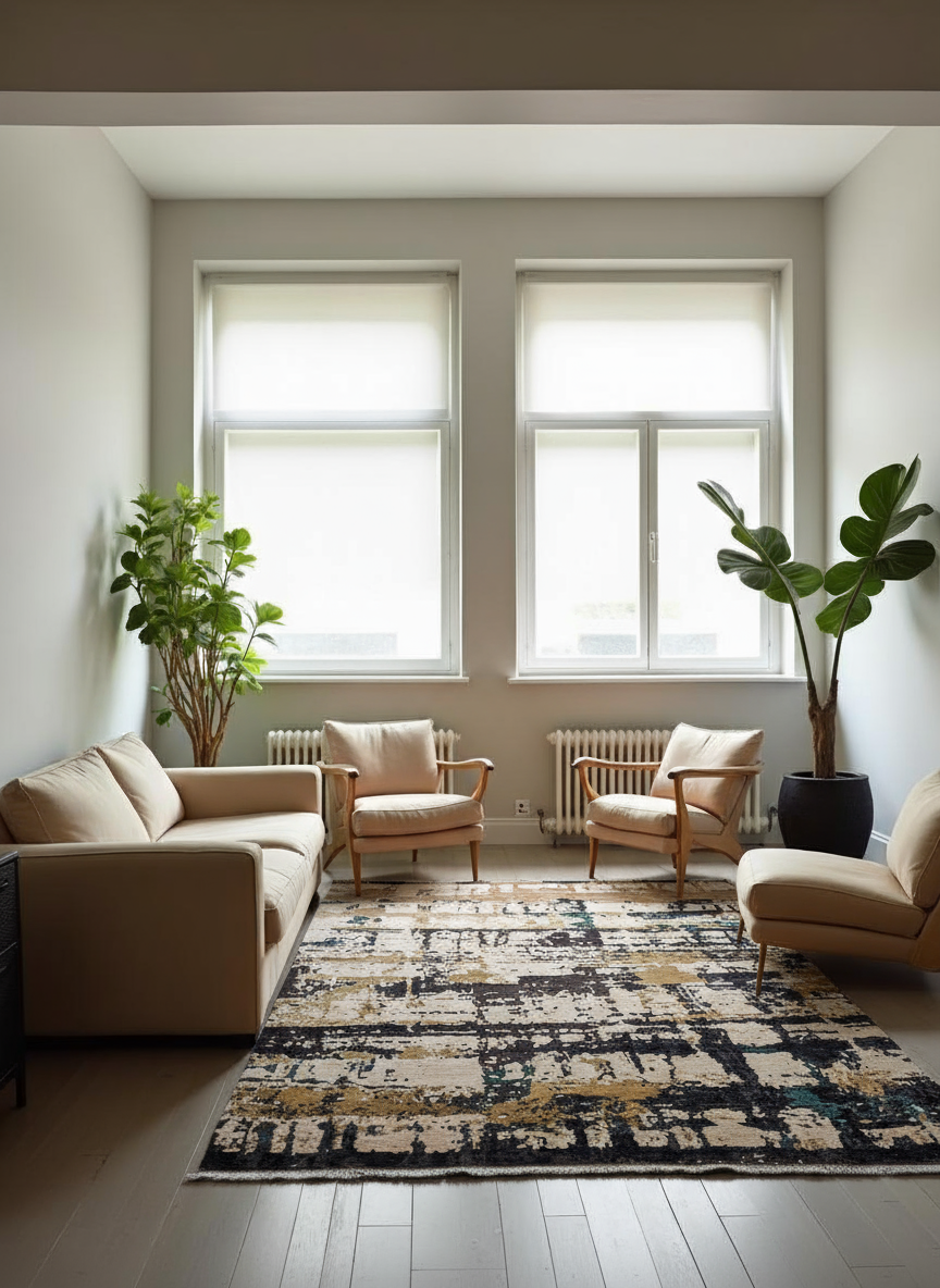 • The rug's colors and patterns shift dramatically with your perspective, coming alive in rich vibrancy when the fibers face you, softening to subtle elegance as they turn away. This inherent interplay is not a flaw, but an elevating quality that renders the rug an interactive work of art.
