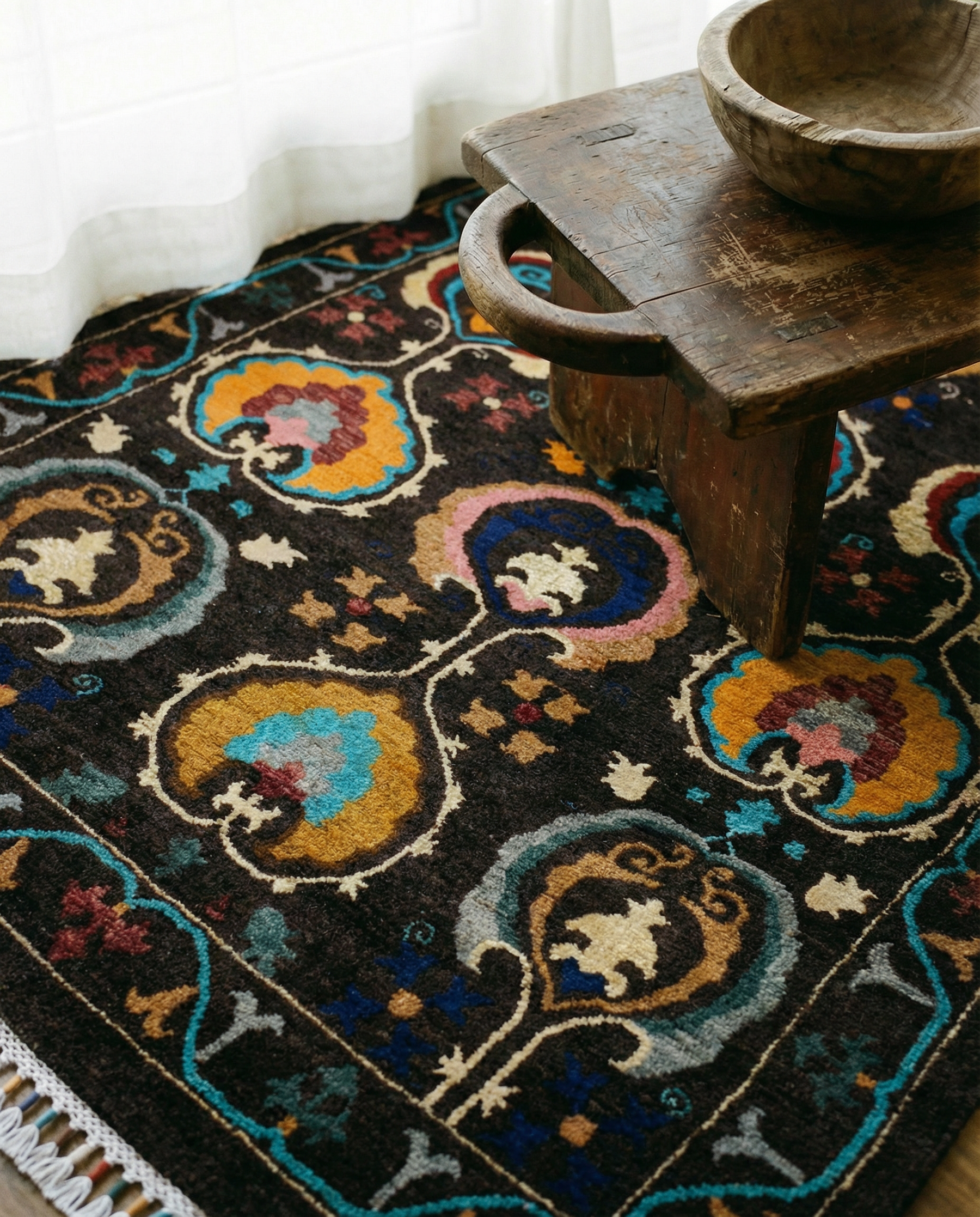 • The rug's colors and patterns shift dramatically with your perspective, coming alive in rich vibrancy when the fibers face you, softening to subtle elegance as they turn away. This inherent interplay is not a flaw, but an elevating quality that renders the rug an interactive work of art.
