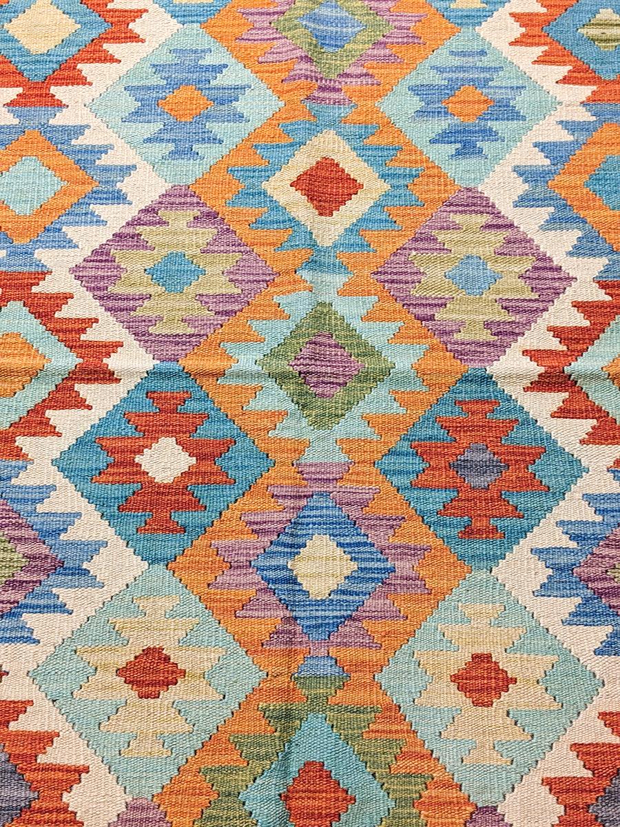This hand-woven Andkhoy Afghan Chobi Kilim, exclusively imported by Imam Carpet Co., brings modern style to any room. Made with wool and vibrant colors, it's perfect for living rooms, bedrooms, and kids' rooms. Measuring 5.5 x 4.3, it adds a touch of Afghan culture to your home.