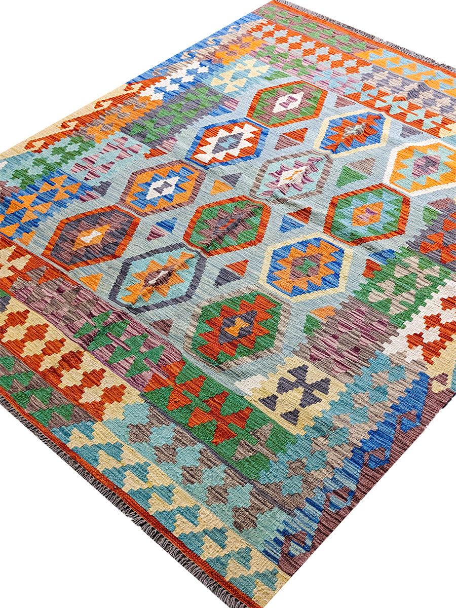 Introducing Bamiyal, a modern style hand-woven Afghan Chobi Kilim. Made with 100% wool and imported by Imam Carpet Co. from Afghanistan, this rug is perfect for any living room, bedroom, or kids room. Its size of 6.7 x 5.2 makes it a versatile and stylish addition to any space.