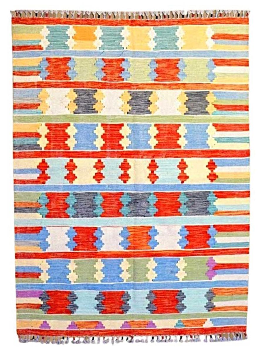 Each rug is a unique, hand-knotted work of art with traditional symbols, this Afghani Chobi Kilim will bring warmth and character to any space. A flatwoven kilim carpet, it is both durable and a natural water-repellent material that lasts for many years. Natural soil-repellant, this kilim rug is durable and can be used on both sides of the weaving. The Afghani Chobi Kilim has the following qualities: