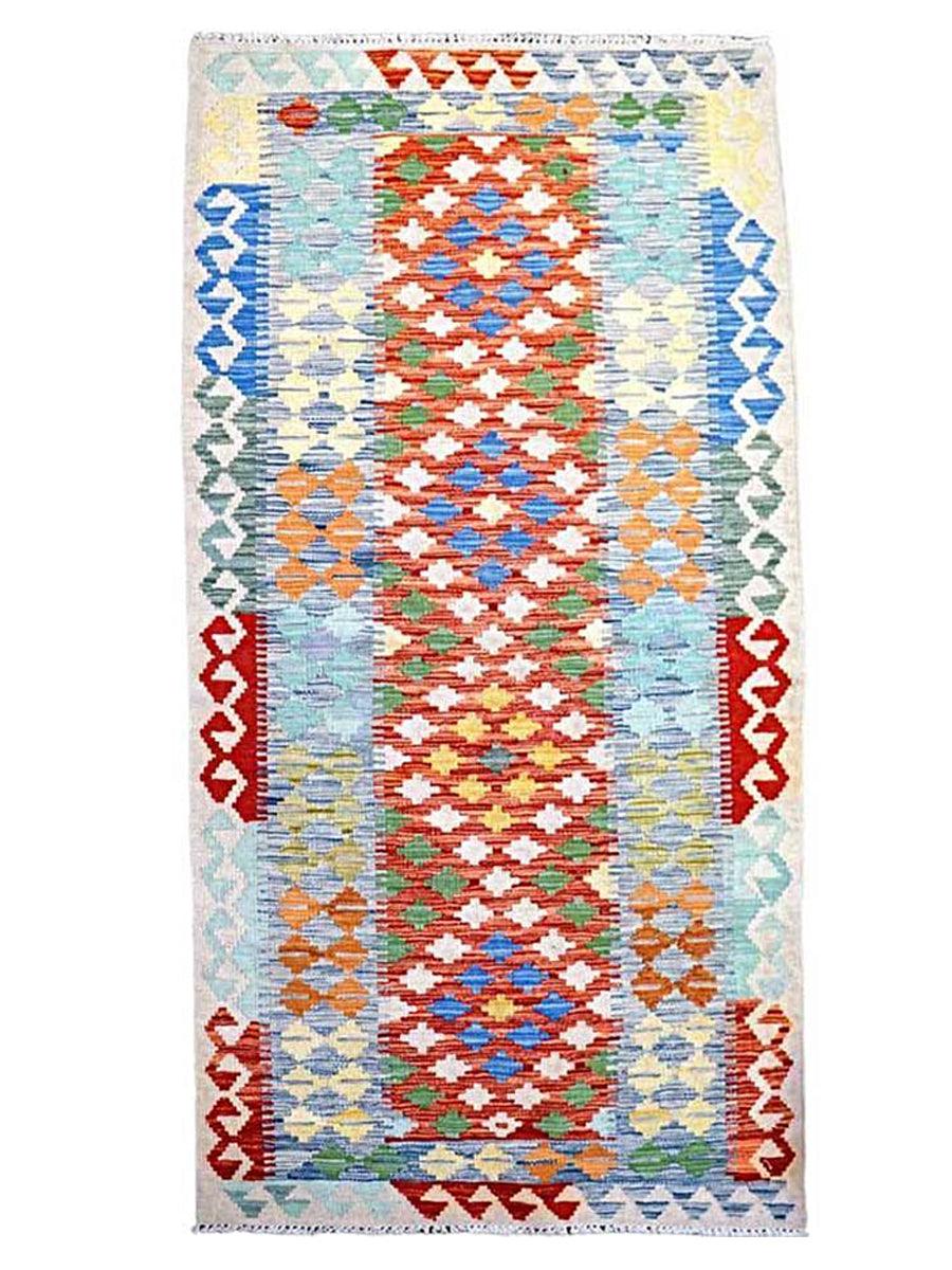 Each rug is a unique, hand-knotted work of art with traditional symbols, this Afghani Chobi Kilim will bring warmth and character to any space. A flatwoven kilim carpet, it is both durable and a natural water-repellent material that lasts for many years. Natural soil-repellant, this kilim rug is durable and can be used on both sides of the weaving. The Afghani Chobi Kilim has the following qualities: