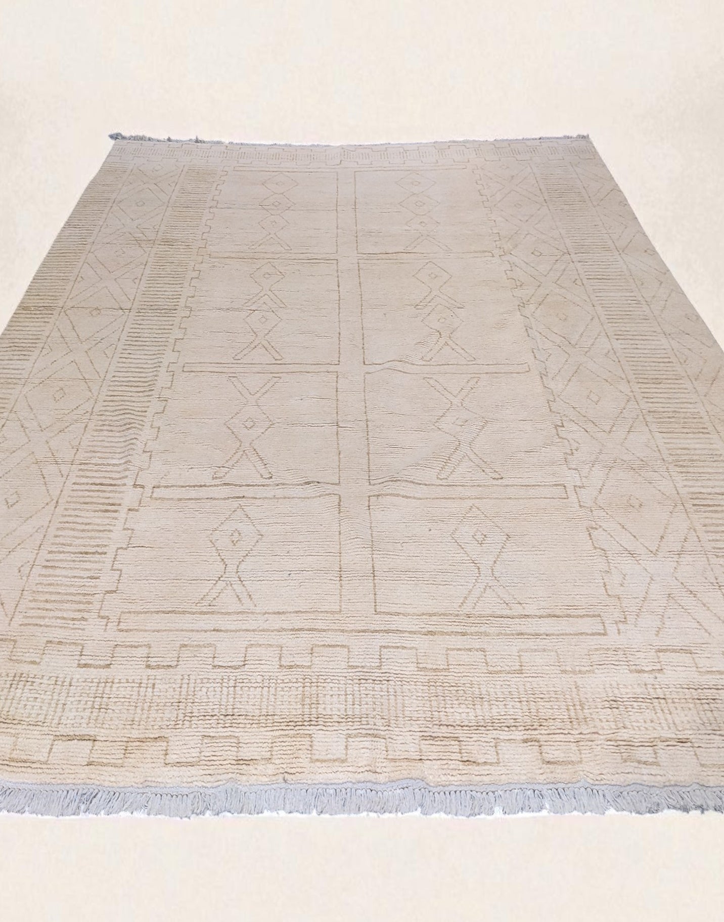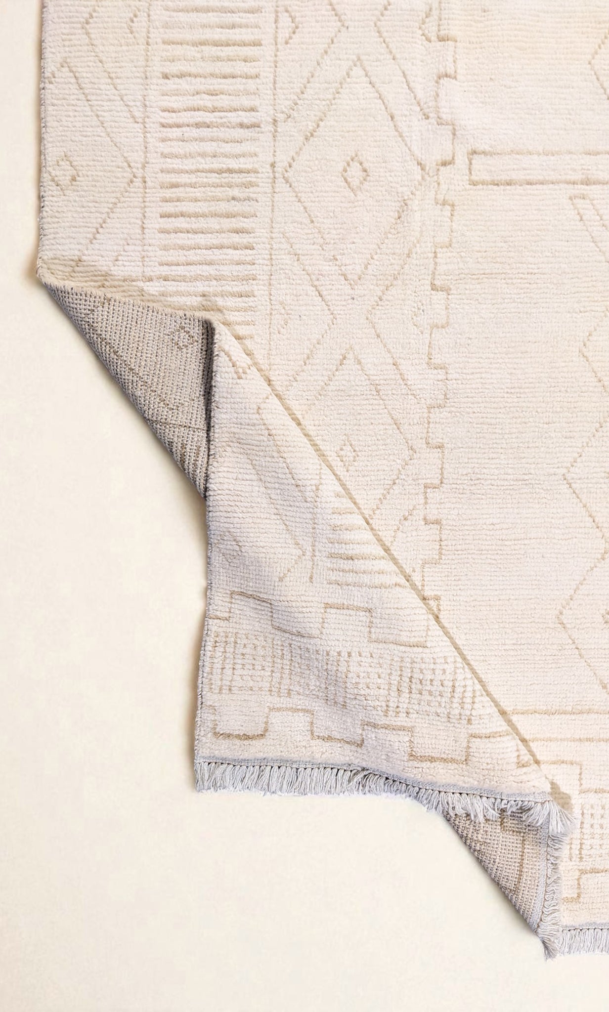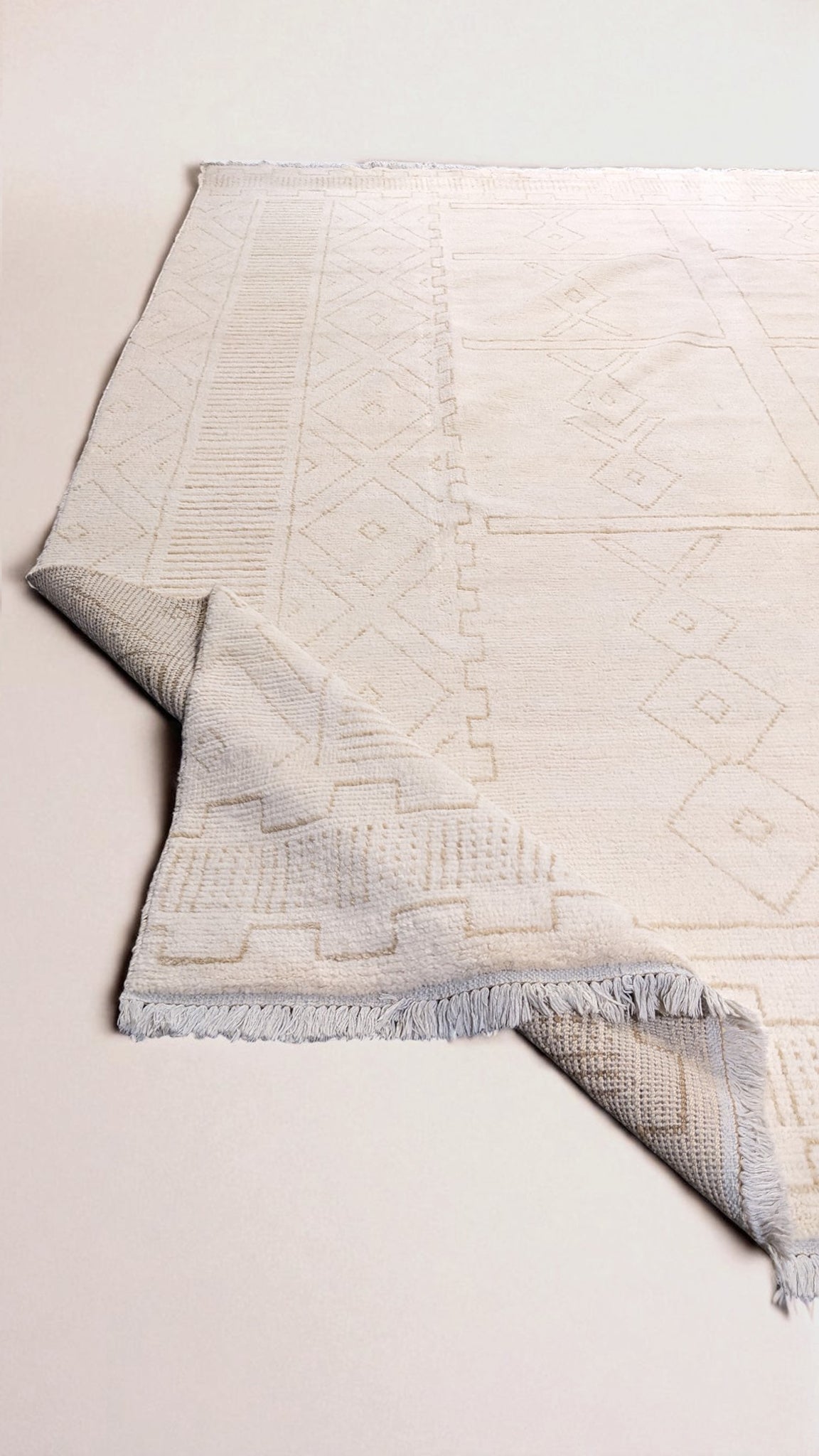 Handmade rugs by Ahsan Imam in natural and neutral tones, capturing the serene beauty of earthy desert landscapes.