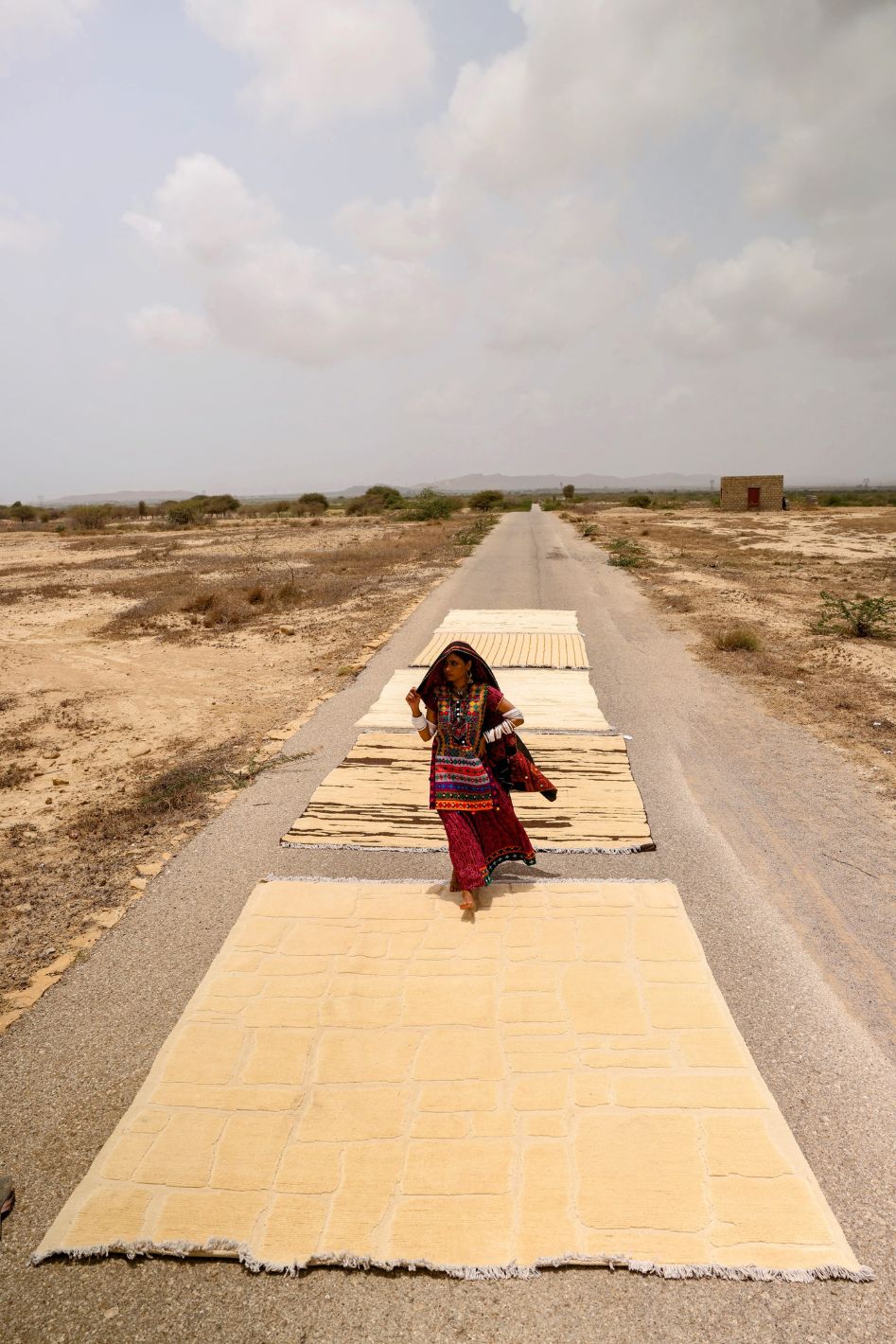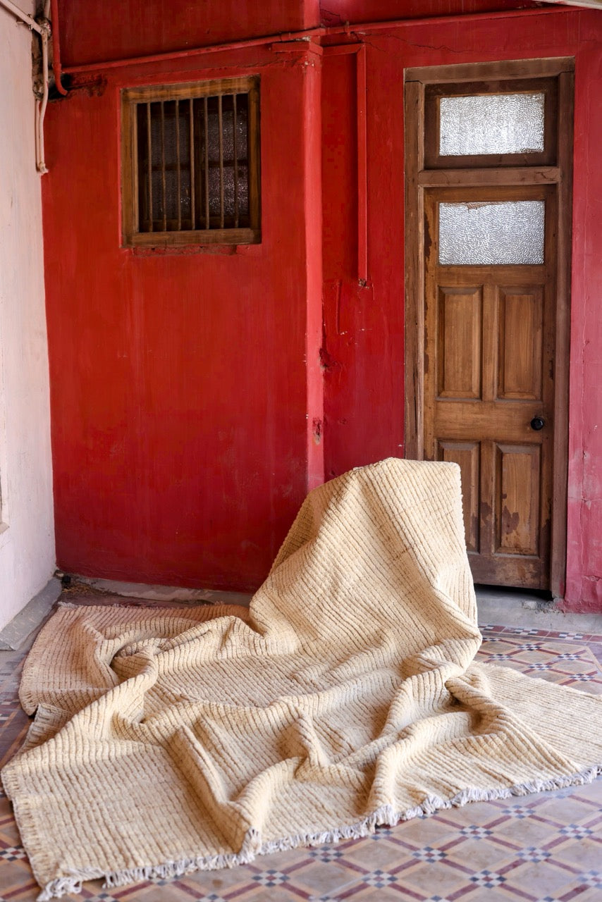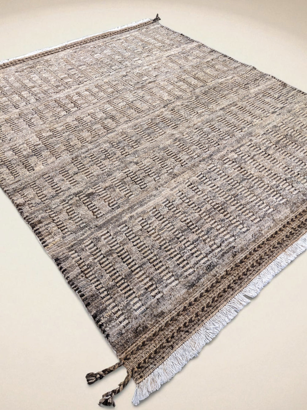 Handmade rugs by Ahsan Imam in natural and neutral tones, capturing the serene beauty of earthy desert landscapes.