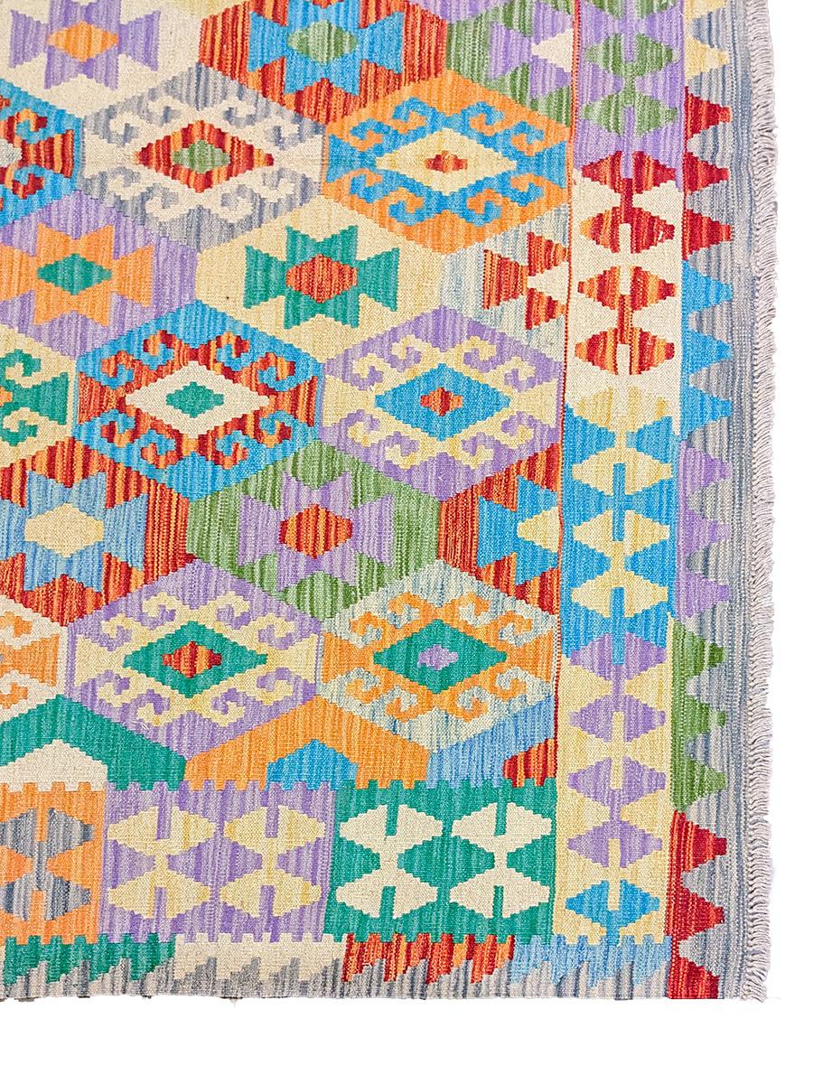 The Takhar Afghan Chobi Kilim is a masterpiece of hand-woven construction, made from high-quality wool materials and imported exclusively by Imam Carpet Co. Its modern style and vibrant multi-color design make it a perfect addition to any room, whether it's a living room, bedroom, or kids room. Enhance your space with this new, beautifully crafted 9.4 x 6.8 rug from Afghanistan.