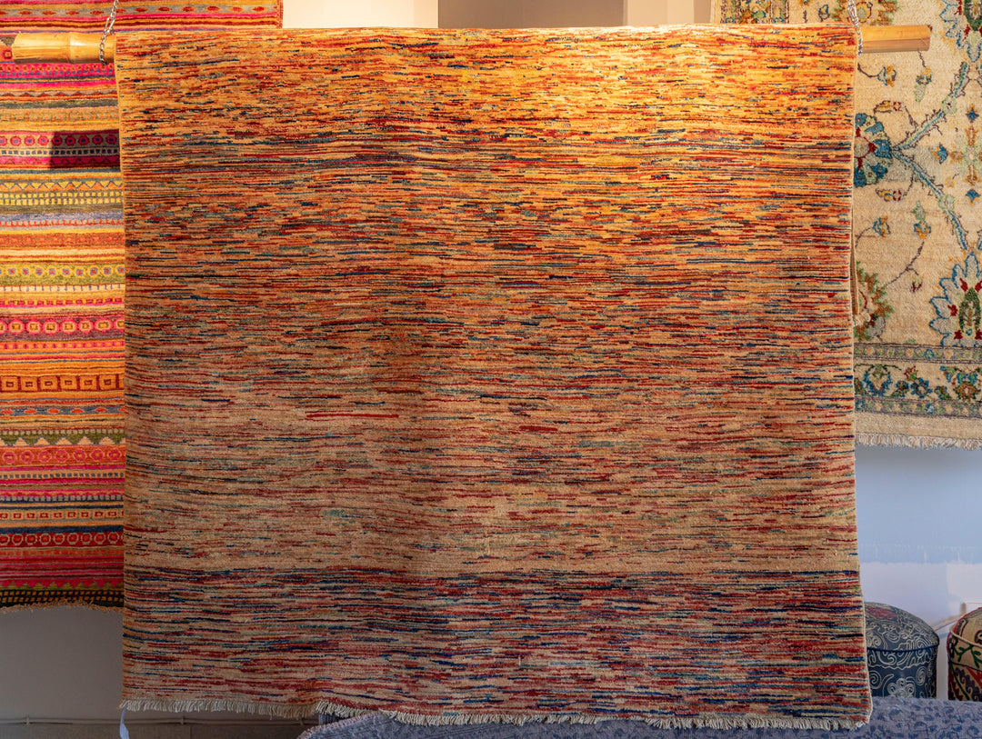 Handmade rugs by Ahsan Imam in natural and neutral tones, capturing the serene beauty of earthy desert landscapes.