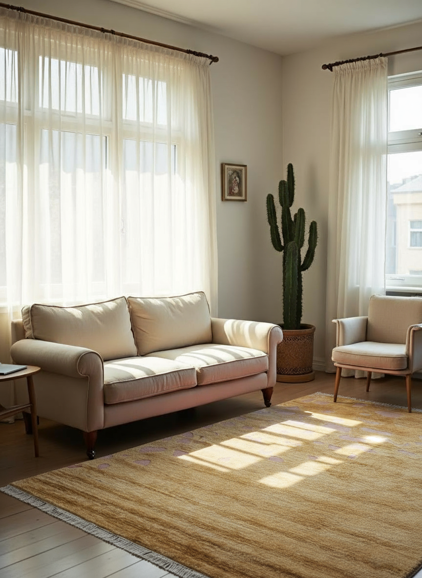 Handmade rugs by Ahsan Imam in natural and neutral tones, capturing the serene beauty of earthy desert landscapes.
