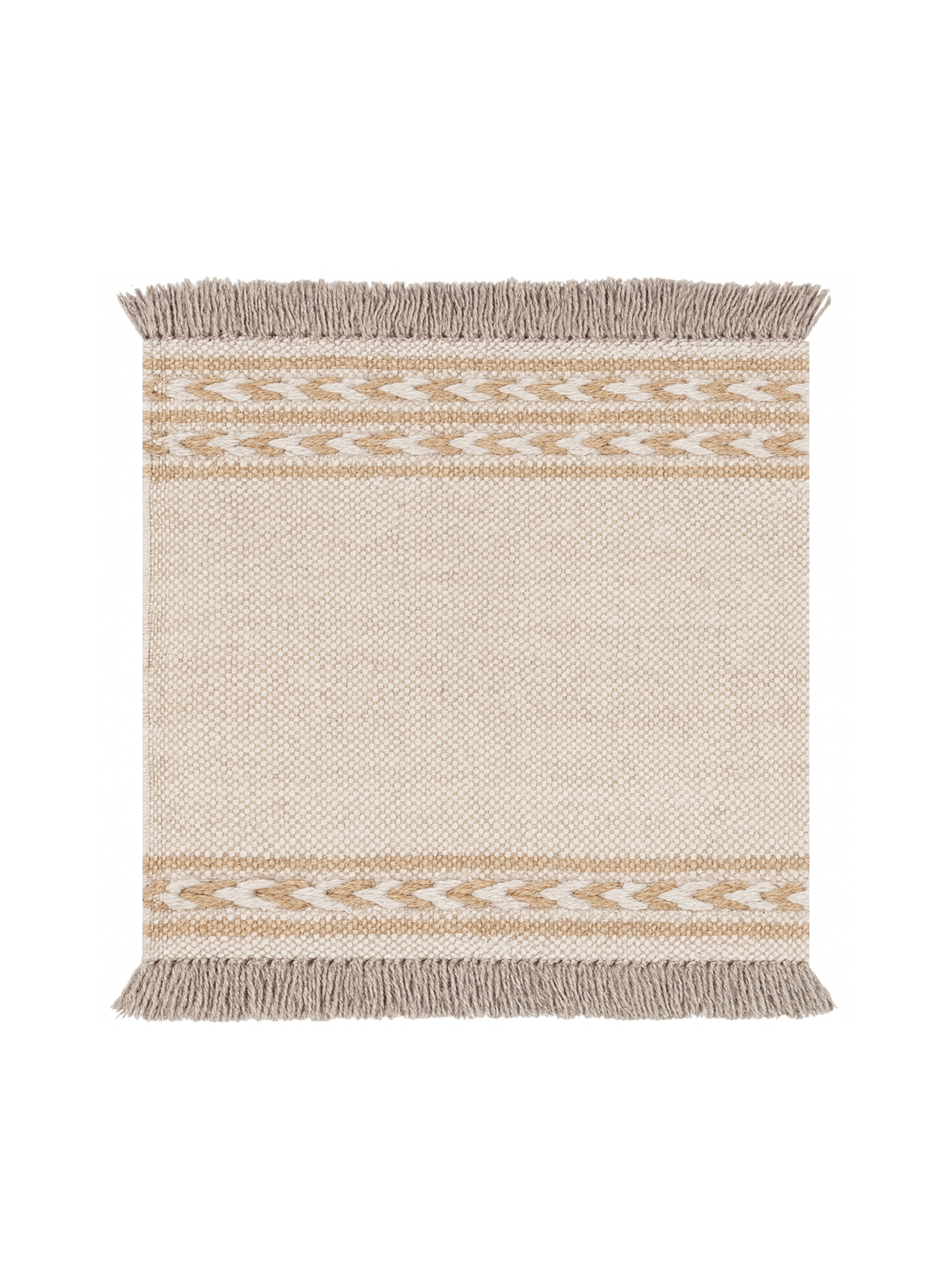 Arden is the epitome of understated elegance, with its solid white or light beige color and subtly textured woven surface. The fine horizontal lines create a gentle rhythm, while the braided border in a slightly darker beige adds a refined touch. Finished with short knotted fringes and delicate tassels at each corner, this handmade area rug brings Scandinavian-inspired minimalism into any room, offering a serene, timeless aesthetic.