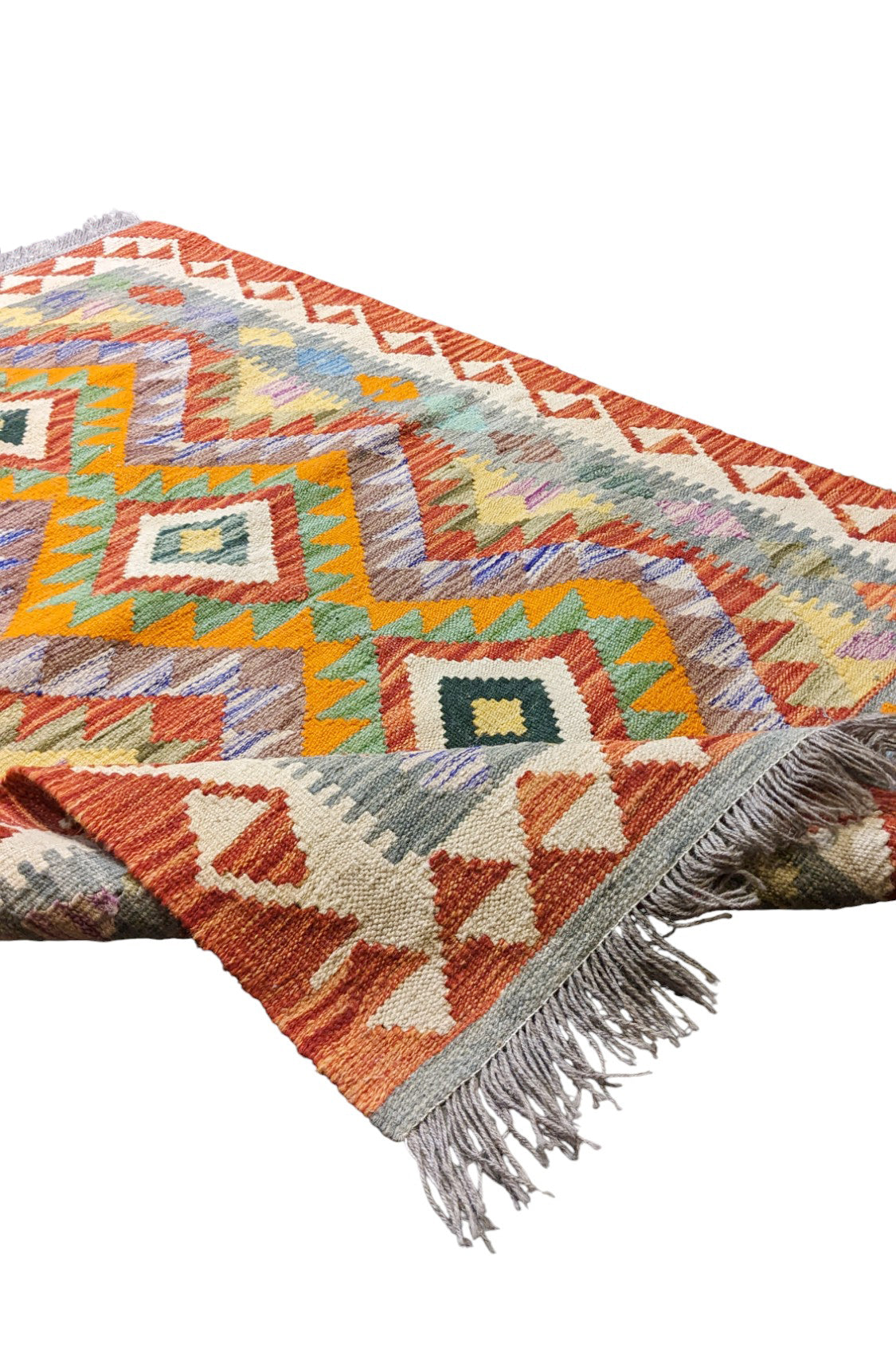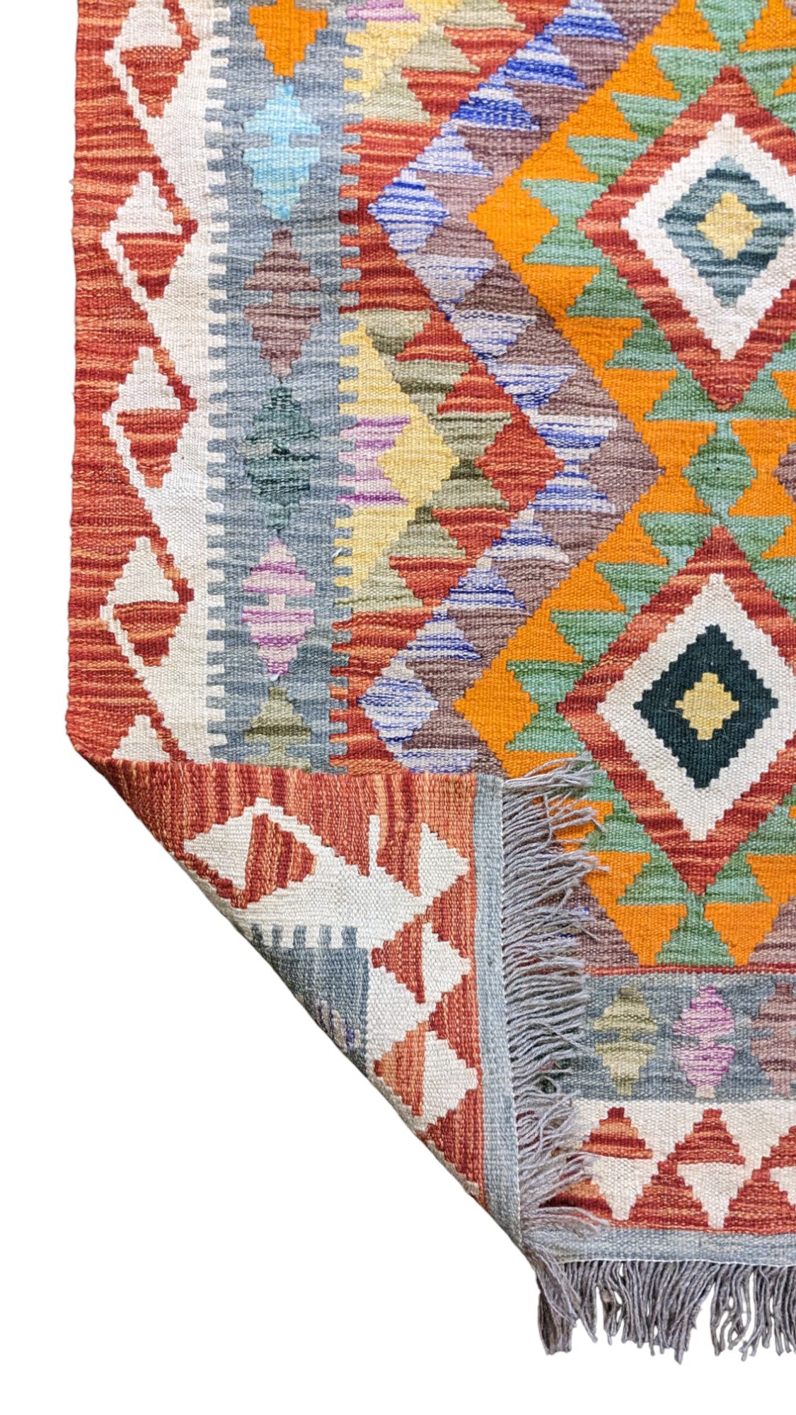 Introducing the luxurious Afghan Chobi Kilim handwoven from 100% wool. This modern rug brings a touch of sophistication to any living room, bedroom, or kids room. this exclusive Imam Carpet Co. import from Afghanistan adds a stylish and unique flair to your space.